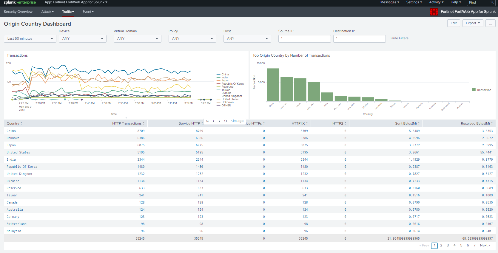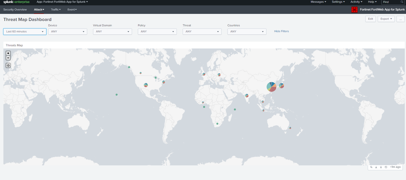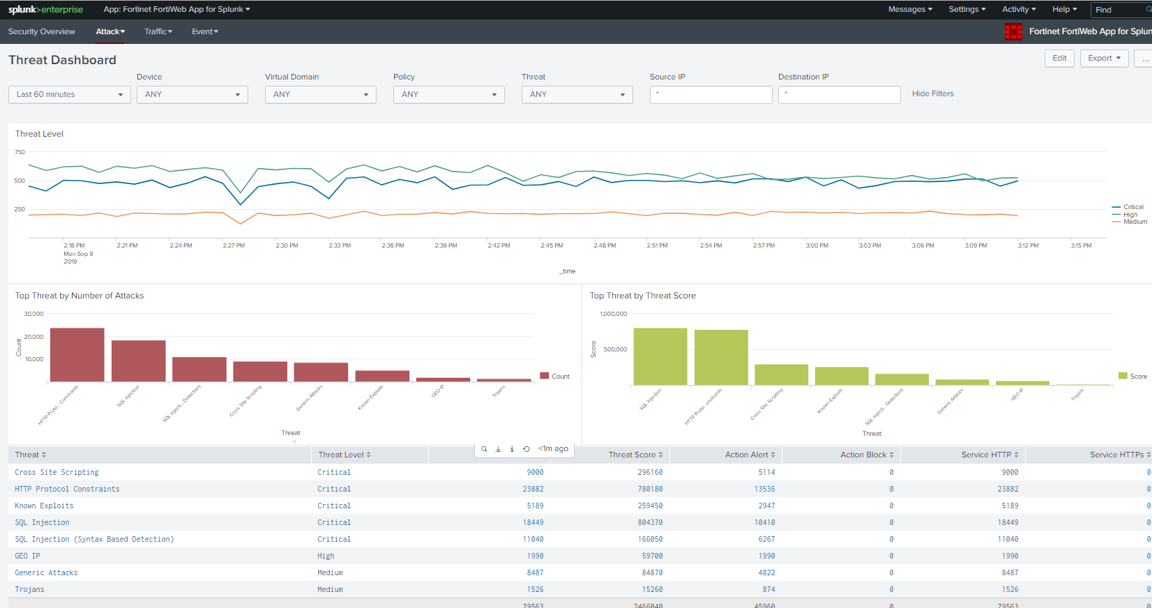 The Fortinet FortiWeb App for Splunk provides real-time and historical dashboard and analytical reports on threats, traffic, events for all products across the FortiWeb physical and virtual appliances. The integrated solution pinpoints threats and attacks with faster response times without long exposure in unknown troubleshooting state.
