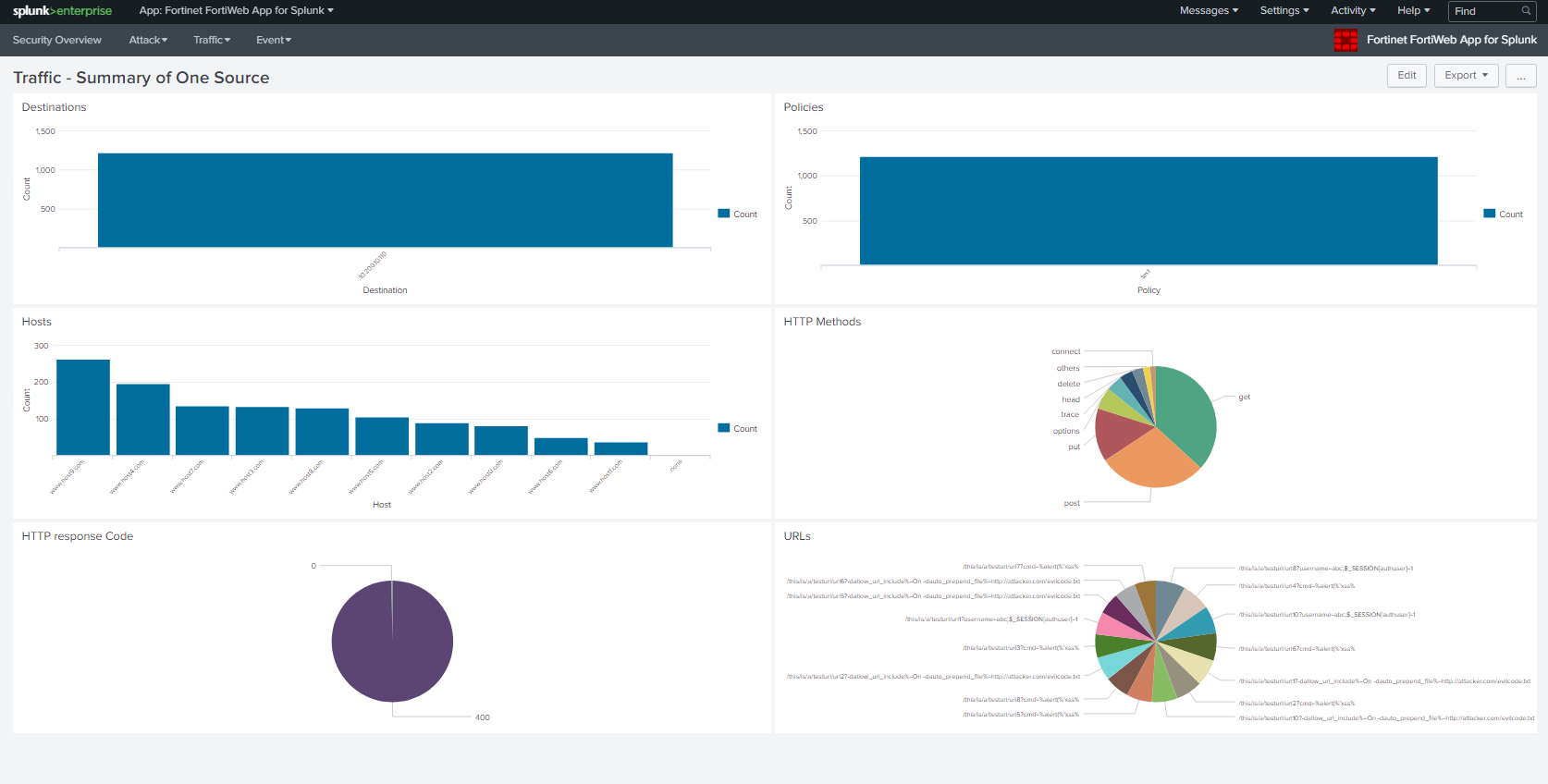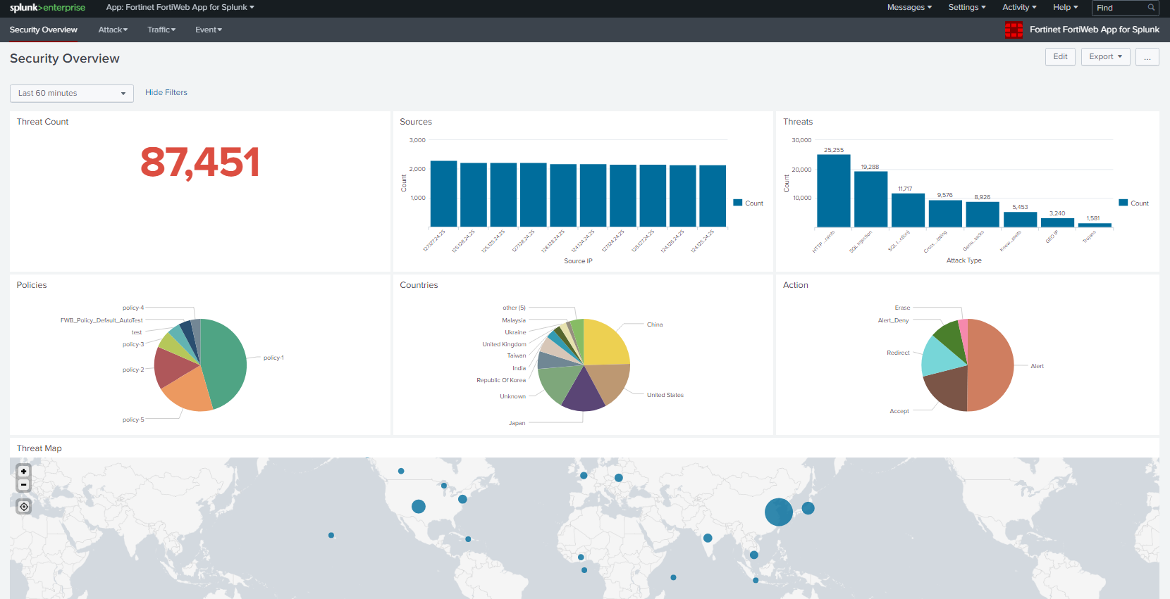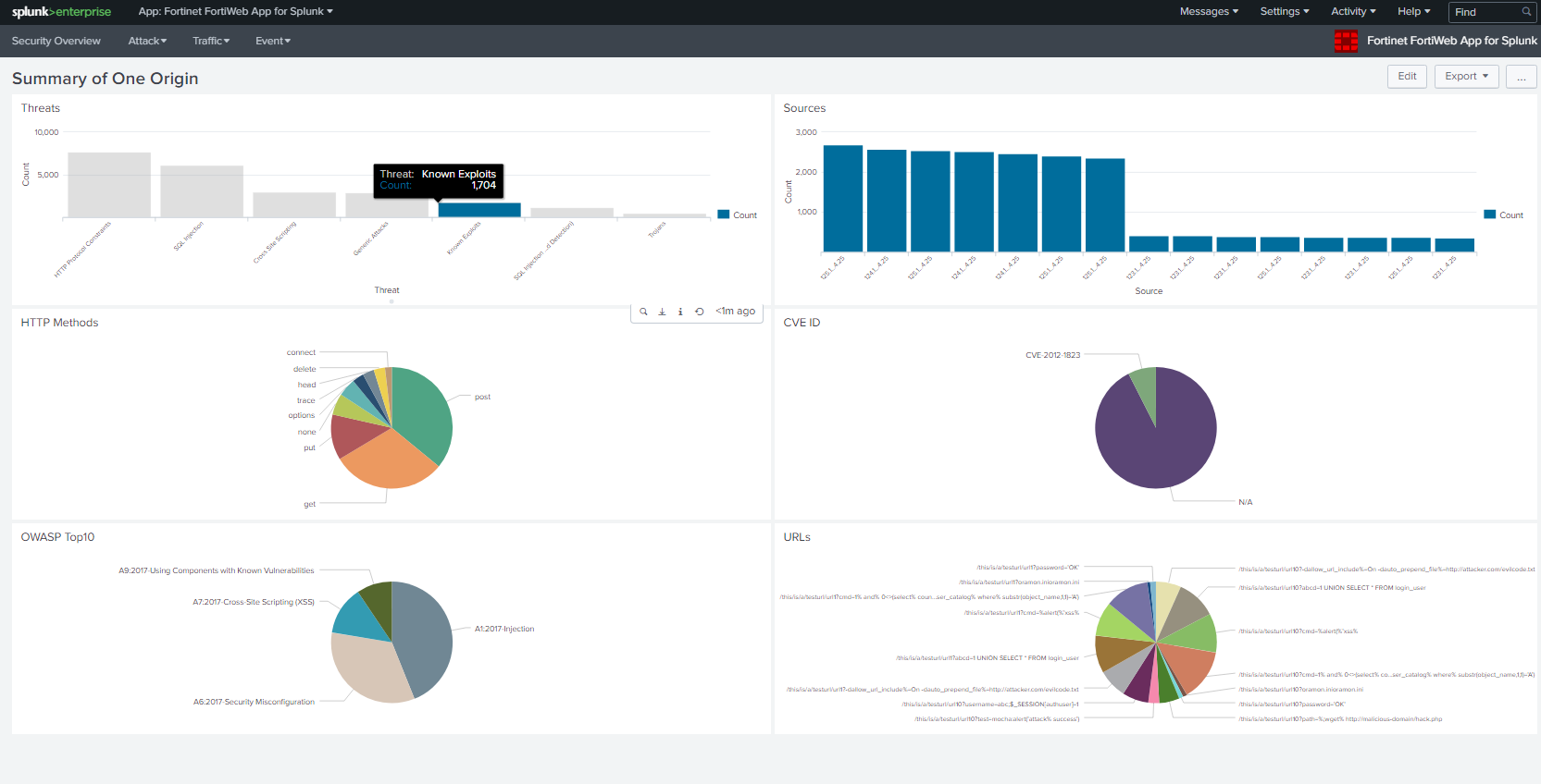 The Fortinet FortiWeb App for Splunk provides real-time and historical dashboard and analytical reports on threats, traffic, events for all products across the FortiWeb physical and virtual appliances. The integrated solution pinpoints threats and attacks with faster response times without long exposure in unknown troubleshooting state.