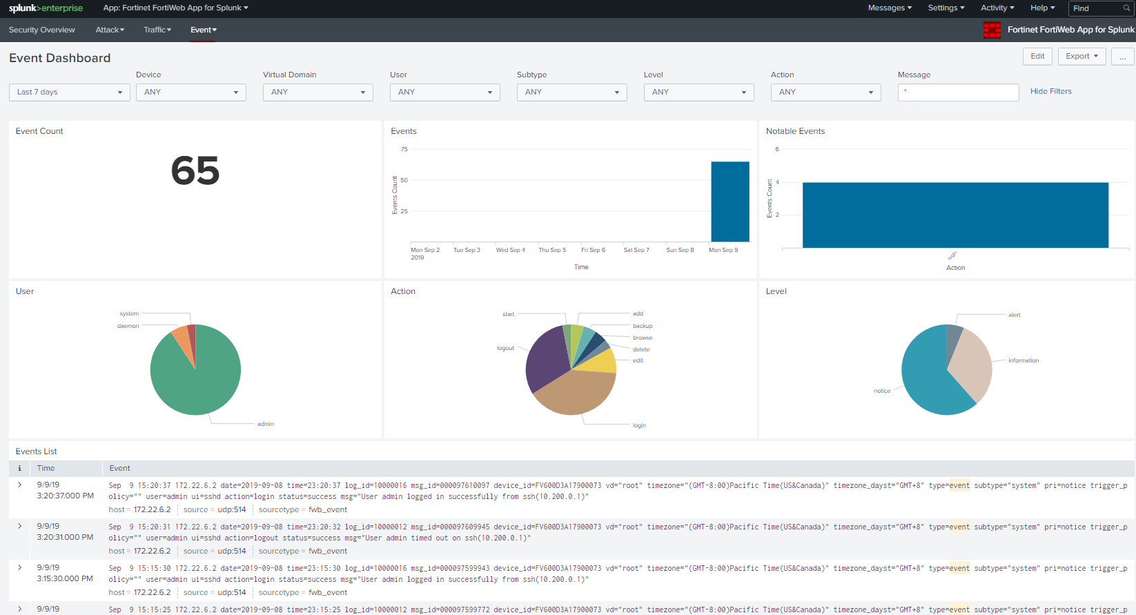 At this point, you will see data parsed and presented on the dashboard of Fortinet FortiWeb App for Splunk.